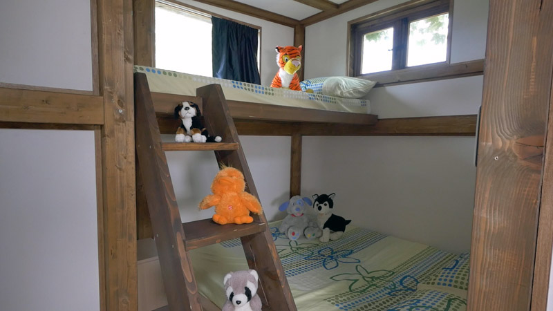 bedroom with double bed and mezzanine accessible by ladder with an additional double bed,